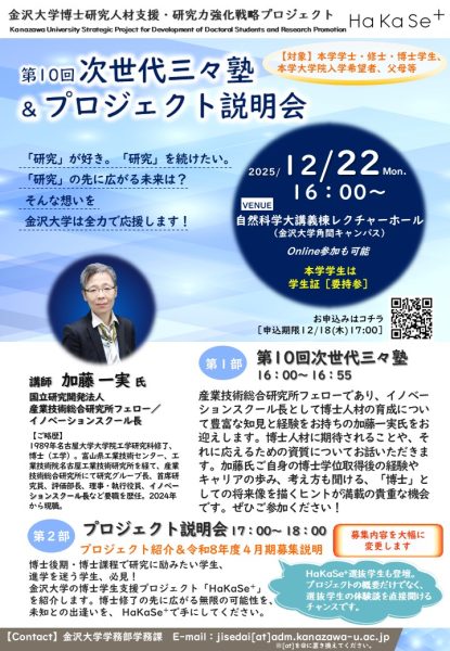 続くプロジェクト説明会では、HaKaSe+の事業概要と令和8年度4月期の募集内容をご紹介するとともに、現在支援を受けている選抜学生による体験談もお聞きいただけます。