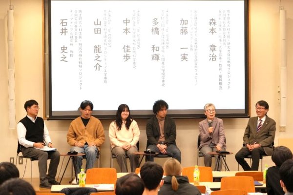 本イベント終盤のトークセッションでは、登壇者全員と司会の石井史之ナノマテリアル研究所教授(HaKaSe+合同実行委員会委員)が、いくつかのトピックについて意見を交わし、博士学位取得を目指したきっかけをめぐって話に花が咲き、和やかな雰囲気が広がりました。